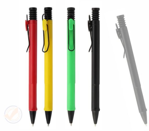 Esfero de plástico con cuerpo de color brillante, resorte superior y punta negra. Ideal para uso diario o promocional.